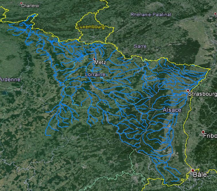 Actuellement, le domaine de simulation « Rhin-Meuse » reprend 13 560 km de rivières (réseau de 1 058 rivières) pour 34 000 km² de bassin versant, situés dans les districts hydrographiques internationaux de la Meuse et du Rhin (Moselle, Rhin).