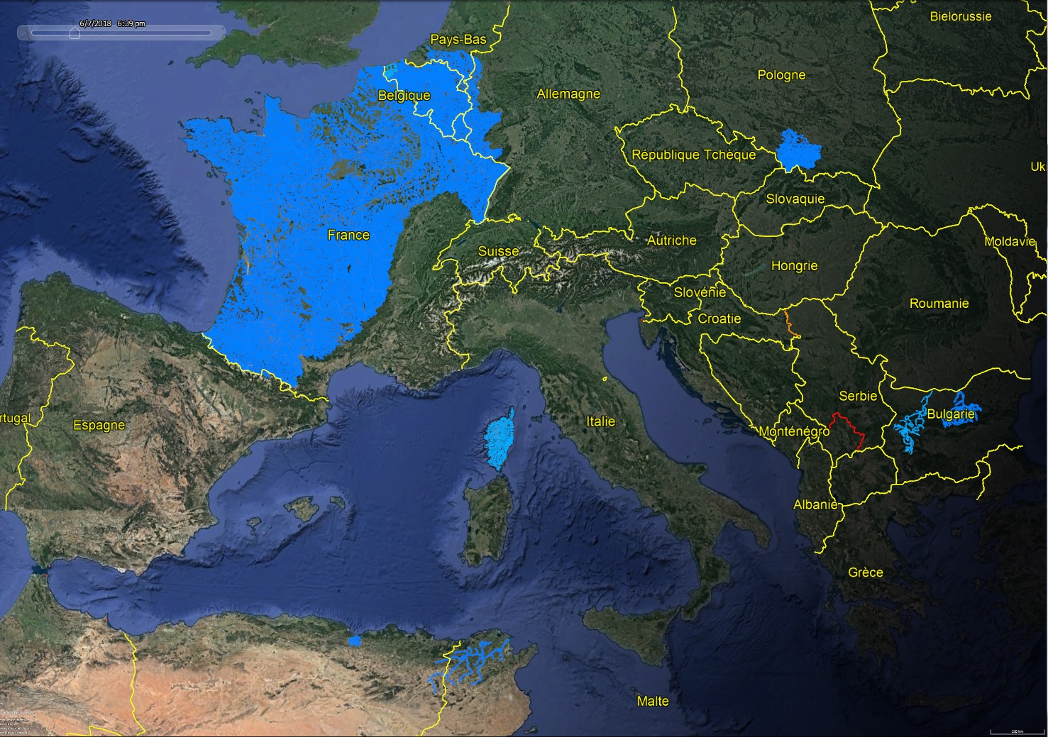 Figure 2 : Applications de Pegase en Europe et au Maghreb (image Google Earth™)